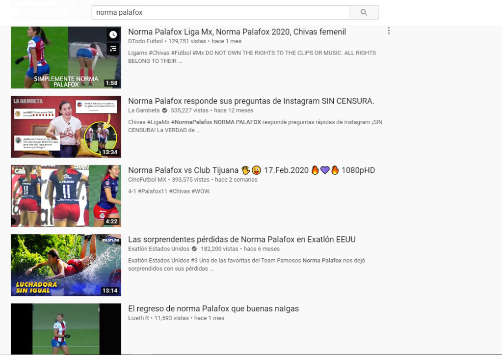 No obstante, cuando alguien decide buscar su nombre en YouTube, los resultados principales no muestran su calidad futbolística o los goles que ha marcado; esos videos resaltan sus atributos físicos; el resultado es el mismo en Google.
